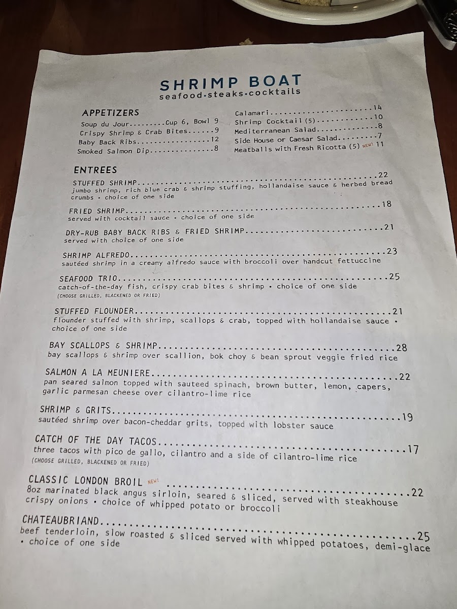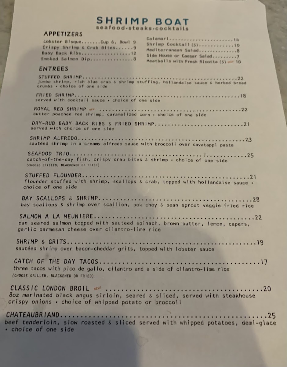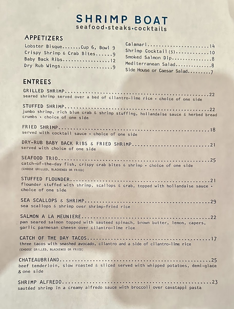 At Shrimp Boat Grill, you’re in for a delicious treat, offering a menu packed with fresh seafood and comforting flavors. Whether you're craving perfectly grilled shrimp, succulent fish tacos, or a hearty bowl of clam chowder, the offerings are sure to satisfy every taste. Their specialties include mouth-watering shrimp platters, fish sandwiches, and classic seafood baskets, all served with a side of tangy sauces that make each bite even better. For those who love variety, there's also a range of appetizers, like crispy calamari and hushpuppies, perfect for sharing or enjoying solo. The cozy, casual vibe makes it an ideal spot to unwind with friends or family while indulging in tasty seafood. Each dish is made with quality ingredients and served with care, ensuring a delightful experience with every visit. Whether you’re a seafood lover or just looking for a great meal, the Shrimp Boat Grill menu has something to offer everyone.