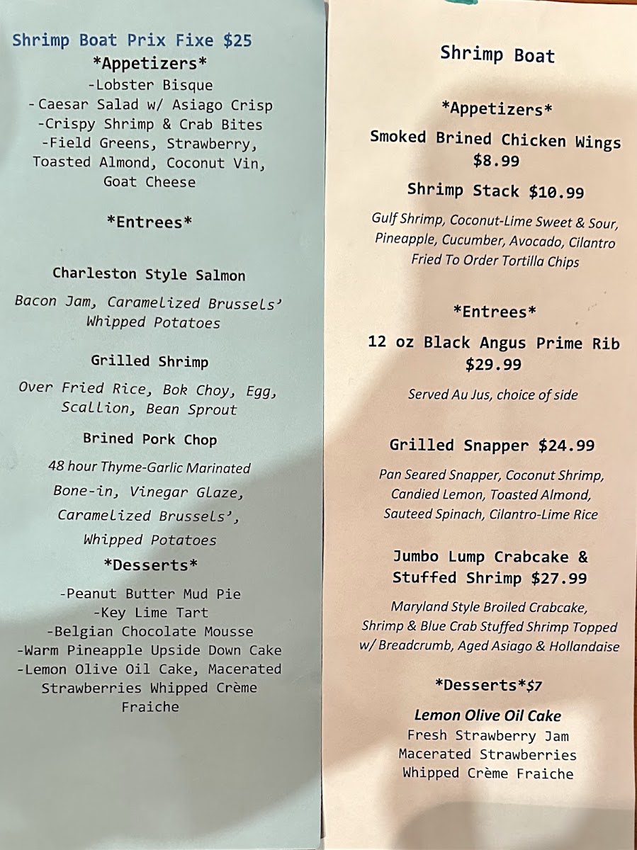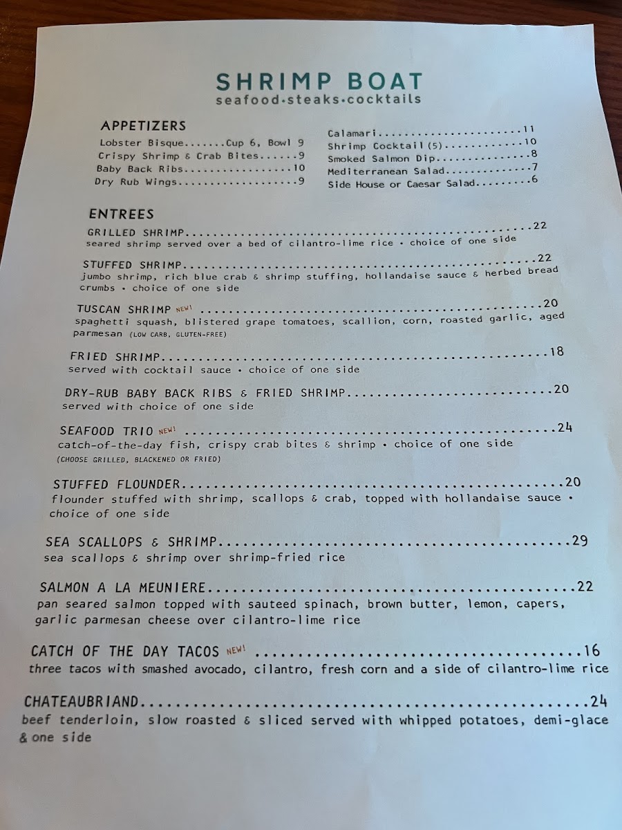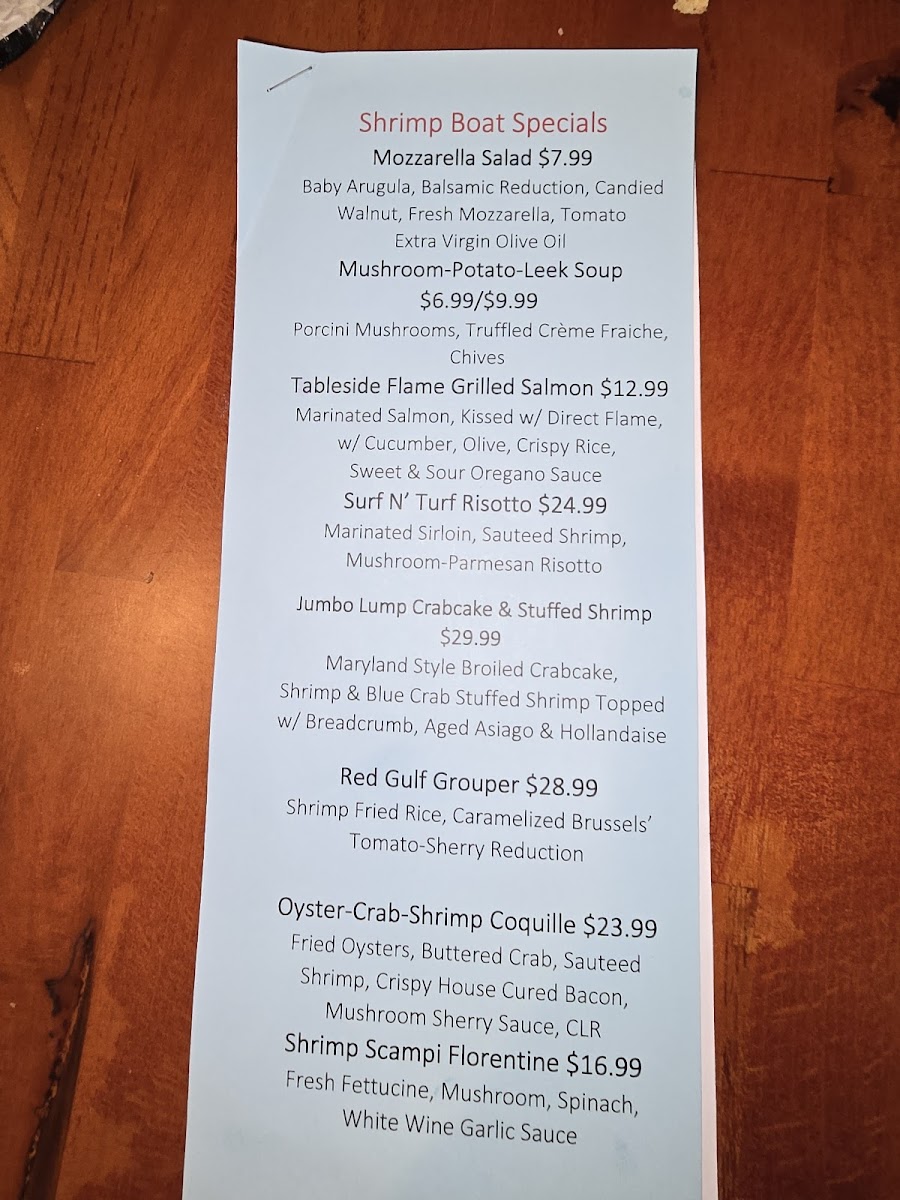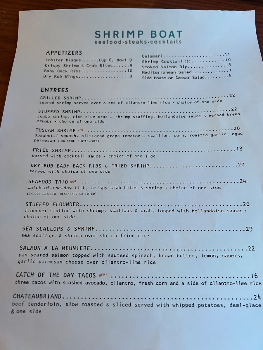 At Shrimp Boat Grill, you’re in for a delicious treat, offering a menu packed with fresh seafood and comforting flavors. Whether you're craving perfectly grilled shrimp, succulent fish tacos, or a hearty bowl of clam chowder, the offerings are sure to satisfy every taste. Their specialties include mouth-watering shrimp platters, fish sandwiches, and classic seafood baskets, all served with a side of tangy sauces that make each bite even better. For those who love variety, there's also a range of appetizers, like crispy calamari and hushpuppies, perfect for sharing or enjoying solo. The cozy, casual vibe makes it an ideal spot to unwind with friends or family while indulging in tasty seafood. Each dish is made with quality ingredients and served with care, ensuring a delightful experience with every visit. Whether you’re a seafood lover or just looking for a great meal, the Shrimp Boat Grill menu has something to offer everyone.